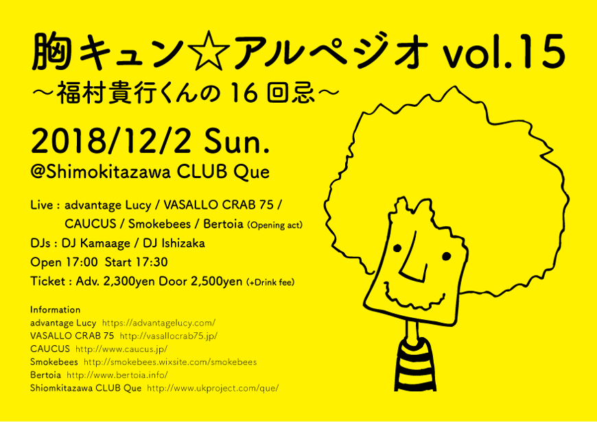 日本のネオアコ―スティックバンドの雄であるadvantage Lucy(アドバンテージルーシー)と6人組ロック・バンドVasallo Crab 75(バサロクラブ75)が毎年恒例となるイベント『胸キュン☆アルペジオvol.15 〜福村貴行くんの16回忌〜』を12月2日に下北沢CLUB Queにて開催する。