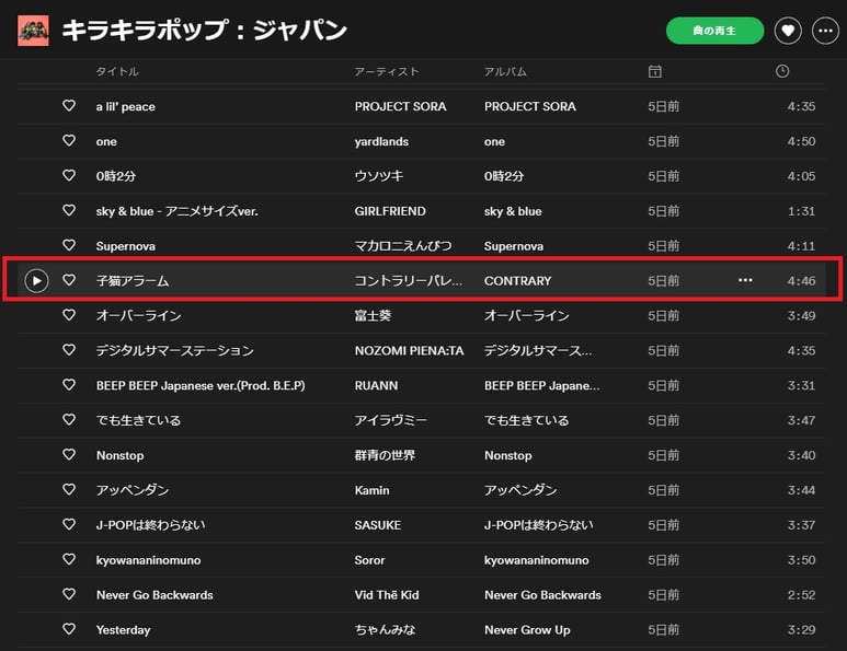 コントラリーパレードの「子猫アラーム」が、Spotifyの公式プレイリスト「キラキラポップ:ジャパン」にリストインしました。
