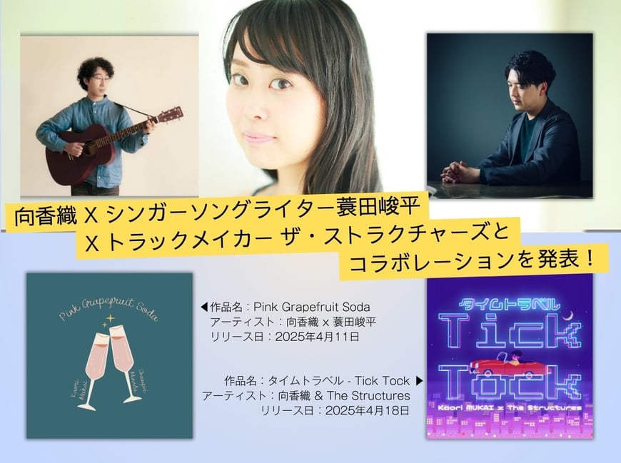 インドネシアと日本の2カ国で活動してきたジャズ・シンガーソングライターの向香織が、2年ぶりとなる新曲を発表、4月11日に「Pink Grapefruit Soda」を、翌週4月18日に「タイムトラベル - Tick Tock」を配信リリースが決定!合わせて本日以降スポティファイのプリセーブ等も順次スタートする。
