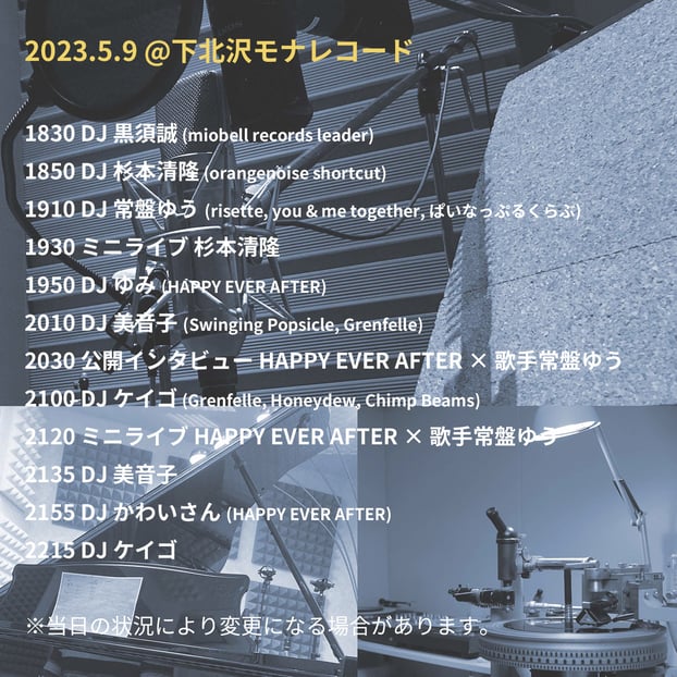 ミオベル・レコードがサポートしているアーティストやレーベルオーナーがDJを務めます。どんな音楽が飛び出すか当日まで誰もわかりません。ちなみにレーベルオーナーは、ギターポップ、ネオアコ、渋谷系、フリーソウル、レア・グルーヴ周辺からの選曲を予定していますよ。お楽しみに!