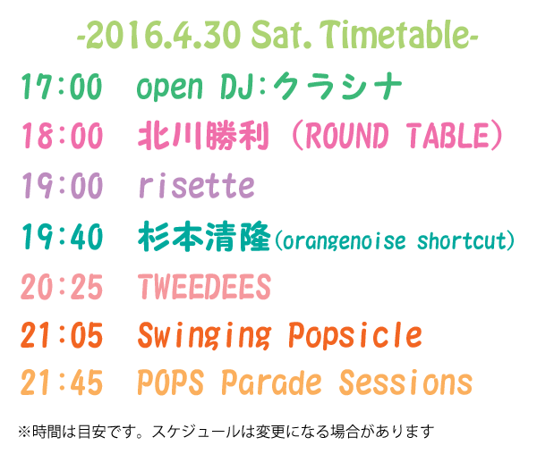 日程は4月30日、ゴールデンウィーク最初の土曜日を選びました。お近くの方も遠方の方もぜひお誘いあわせの上、遊びに来てください。グッドな音楽でハッピーな時間を皆さんと過ごせるよう、出演者・スタッフ一同お待ちしております。