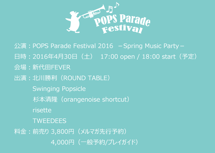 ・POPS Paradeでは事務局スタッフや出演者による撮影、録音・録画をいたします。都合上お客様が写りこむ場合があります。当日撮影した内容は後日ライブレポートなどでポプシクリップ。上や出演者のWEBサイト、各種SNS、Youtubeなどの動画サービス、当方から情報提供する第三者(WEB・雑誌メディアなど)に掲載される場合があります。特にステージから出演者とお客様全員で集合写真を撮影し、SNSやブログ等で公開することはよくあります。前の方で観られる方は特にご注意ください。