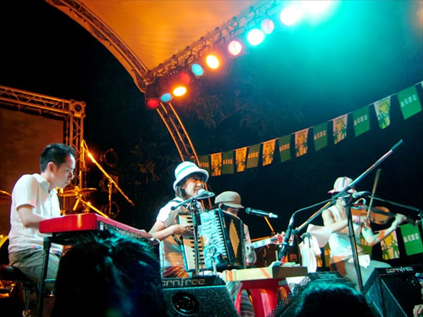 2006年、台湾の夏フェスでは坦々麺発祥のお店や夜市で食べ歩きしてその翌月、 新潟の本屋さんのインストアライブ前には日本海でみんなで泳いで、 2010年の仙台ツアーでは海の幸を目一杯堪能!