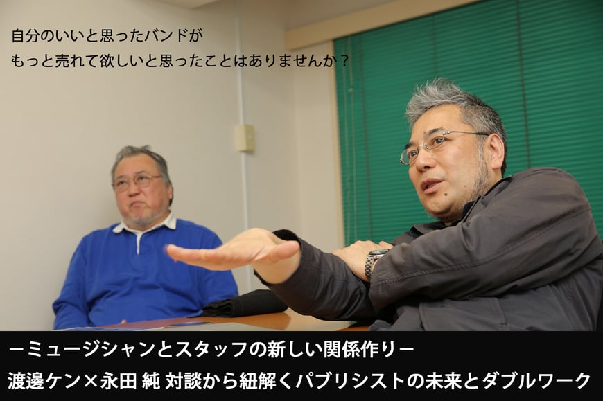 音楽業界の環境変化やインターネットの到来により、パソコン1台で作品をリリースすることができる時代になりました。当然ながらこれまでのレーベルや事務所依存型から脱却したミュージシャンとスタッフの新しい関係もあちこちで生まれています。今回はDIYミュージシャンをサポートをしているMCA(一般社団法人ミュージック・クリエイターズ・エージェント)の代表である永田純さんと、音楽配信サイトOTOTOY でパブリシスト講座の講師をしており、かつては洋楽大物アーティストやドリカムなどを担当され、今も多くのインディーズバンドにアドバイスをしている渡邊ケンさんに「これからのインディーズバンドとスタッフの関係、パブリシストの役割」についてお話を伺いました。(2016年6月26日)